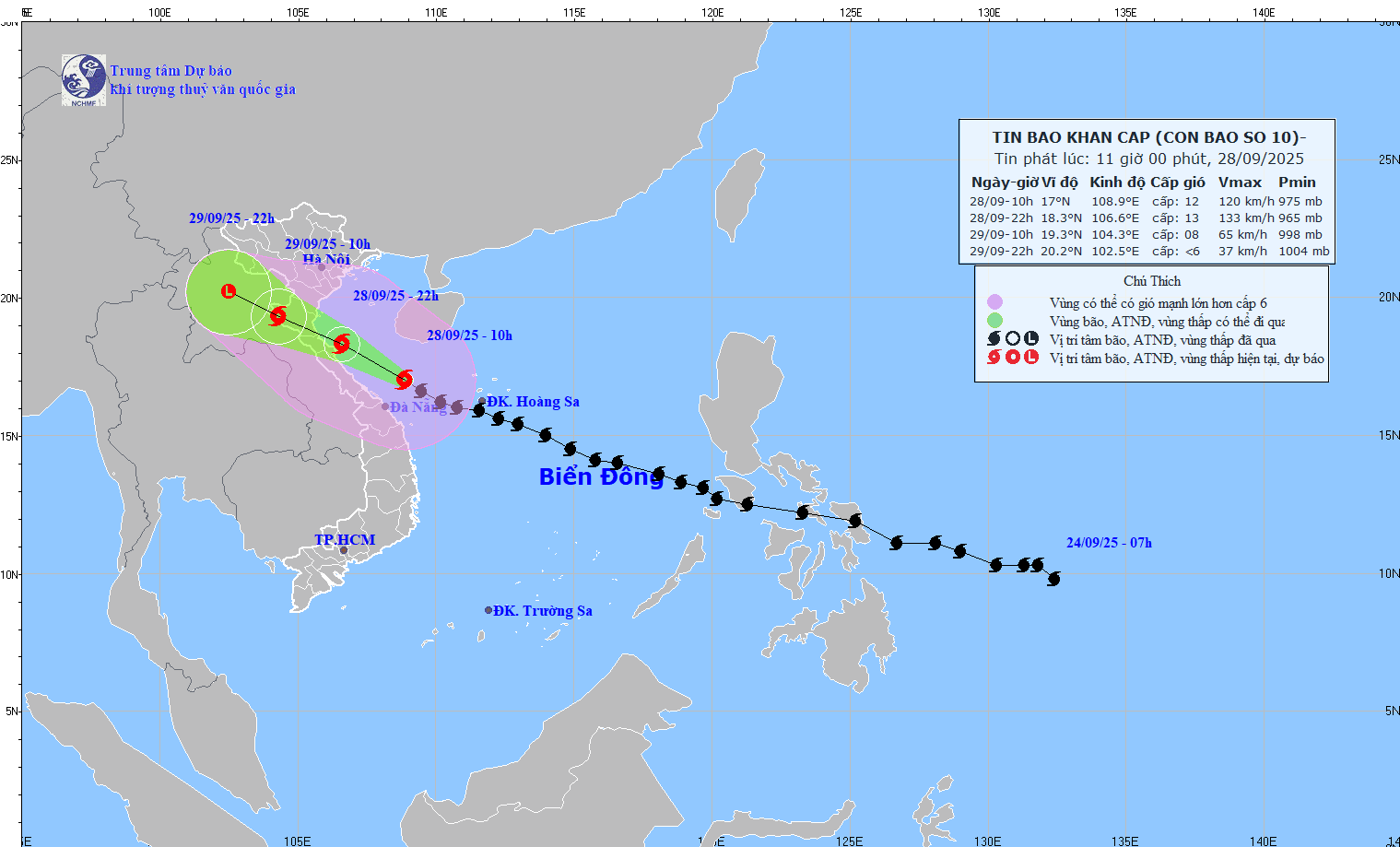 Hồi 10 giờ ngày 28/9, vị trí tâm bão ở vào khoảng 17,0 độ Vĩ Bắc; 108,9 độ Kinh Đông, trên vùng biển Quảng Trị-Tp. Đà Nẵng, cách Tp. Huế khoảng 140km về phía Đông Đông Bắc, cách Bắc Quảng Trị khoảng 260km về phía Đông Đông Nam. Sức gió mạnh nhất vùng gần tâm bão mạnh cấp 12 (118-133km/giờ), giật cấp 15. Di chuyển theo hướng Tây Tây Bắc với tốc độ khoảng 25km/h.