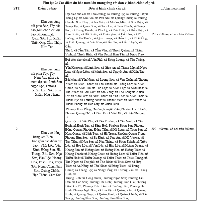 (Chi tiết các điểm dự báo mưa lớn tương ứng với đơn vị hành chính cấp xã ở phụ lục 2)