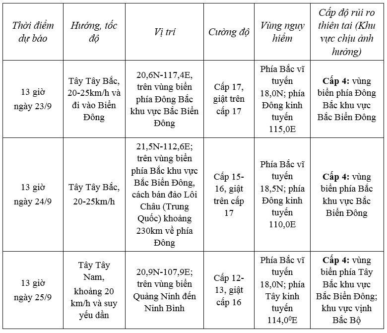 Từ ngày 24/9, khu vực vịnh Bắc Bộ gió mạnh dần lên cấp 6-7, sau tăng lên cấp 8-10, vùng gần tâm bão đi qua cấp 11-13, giật trên cấp 16, sóng biển cao 5,0-7,0m; biển động dữ dội.